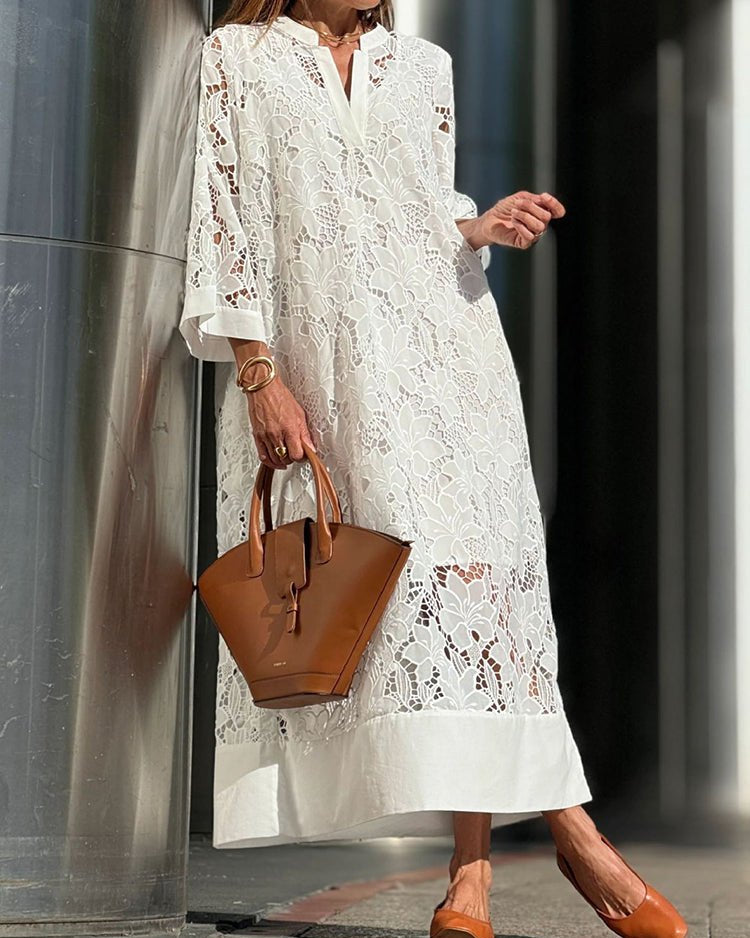 Das Juliette-Sommerkleid verbindet mühelos Stil und Komfort. Aus leichtem Material mit einem wunderschönen, floralen Cut-out-Muster gefertigt, fällt es locker und sorgt an warmen Tagen für ein angenehm luftiges Tragegefühl.