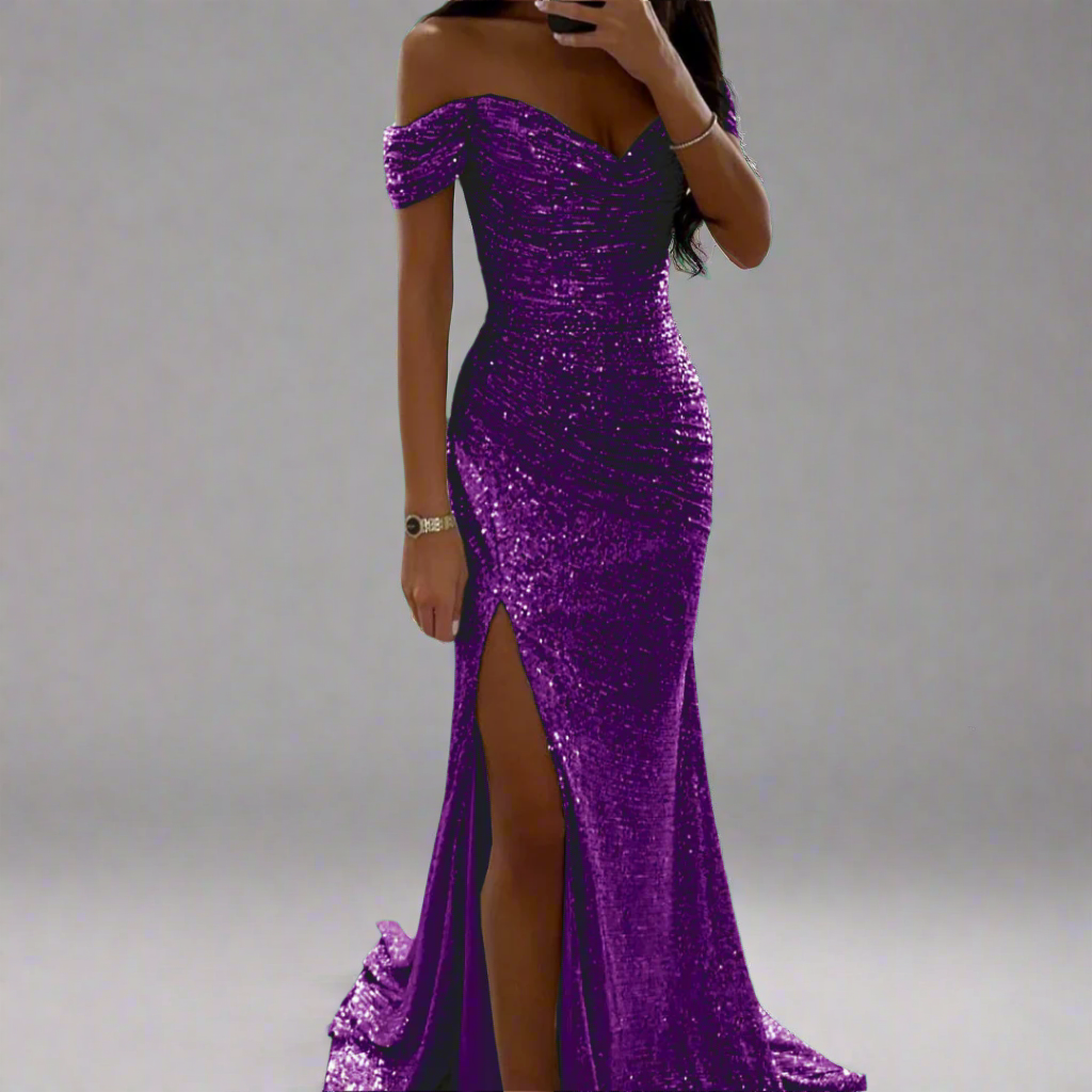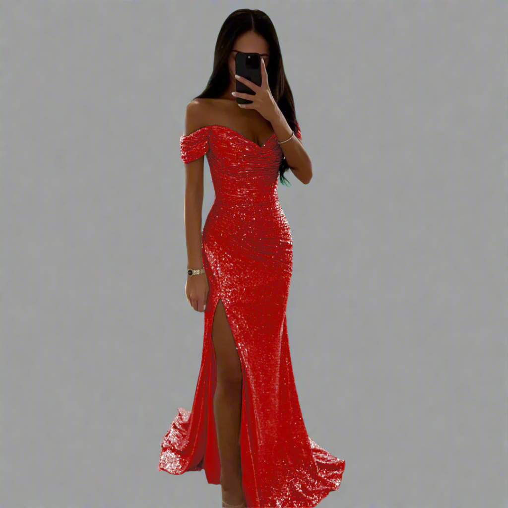 Unser beliebtes Off-Shoulder Kleid mit sexy Beinschlitz sorgt für den perfekten Wow-Effekt – ob auf Partys, Hochzeiten oder besonderen Anlässen. Der funkelnde Stoff und der elegante Schnitt machen es zu einem unserer meistgetragenen Kleider für besondere Momente.